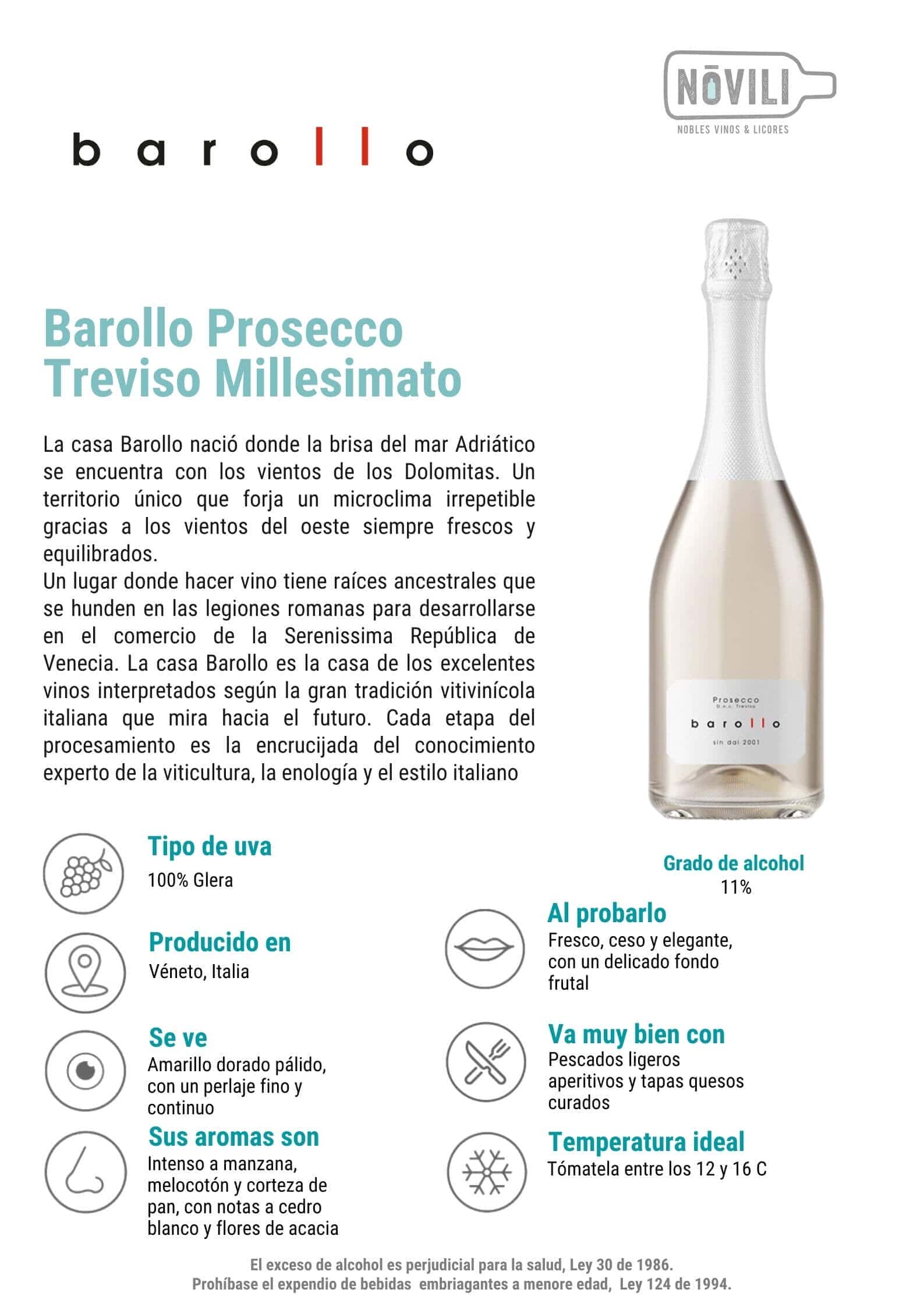 - Temperatura ideal: disfruta más tu botella de Barollo Prosecco Millesimato Brut a una temperatura entre los 10 y 12°C.
