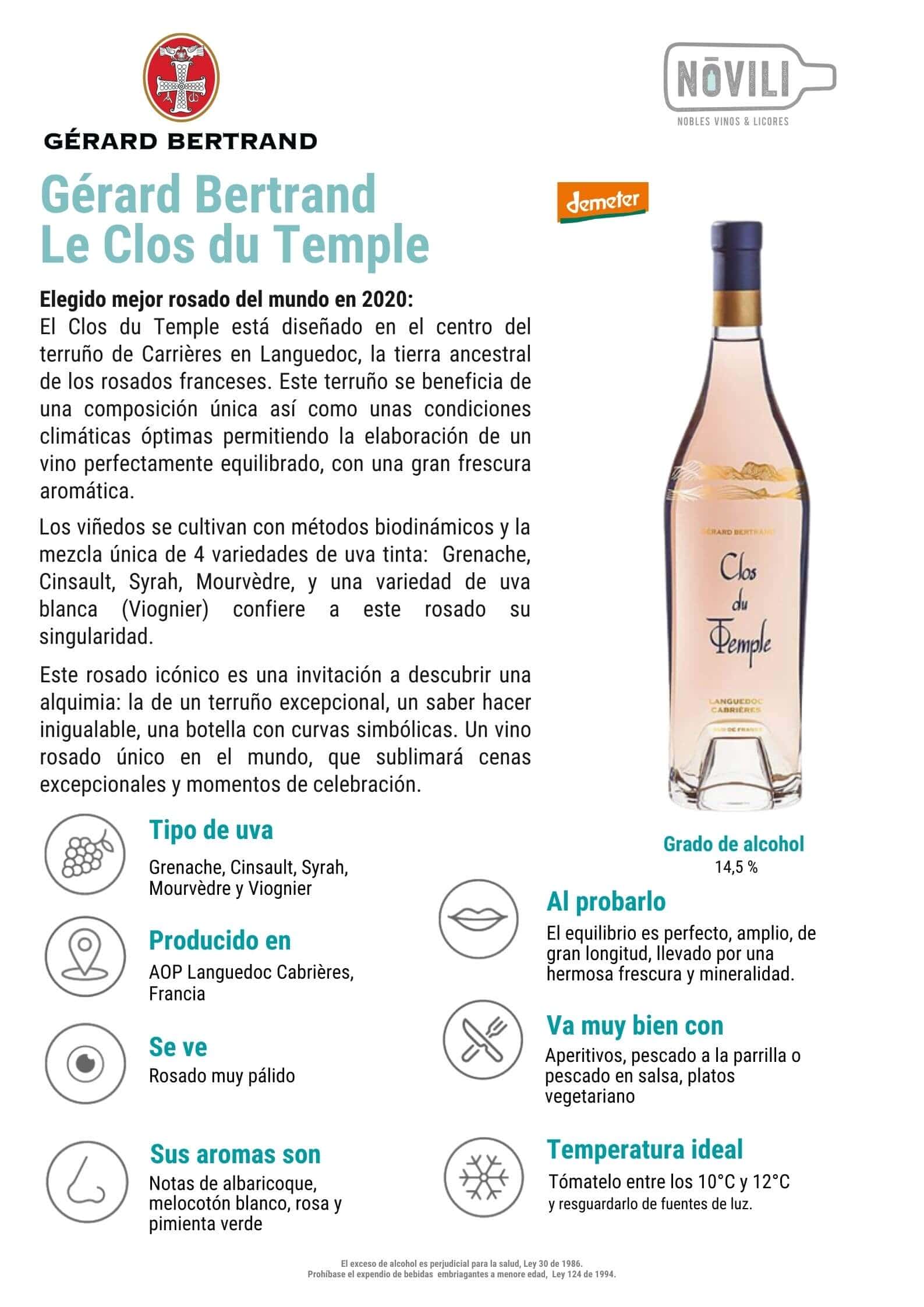 - Temperatura ideal: disfruta más tu botella de Clos du Temple Rose by Gerard Bertrand a una temperatura entre 8 y 10°C.