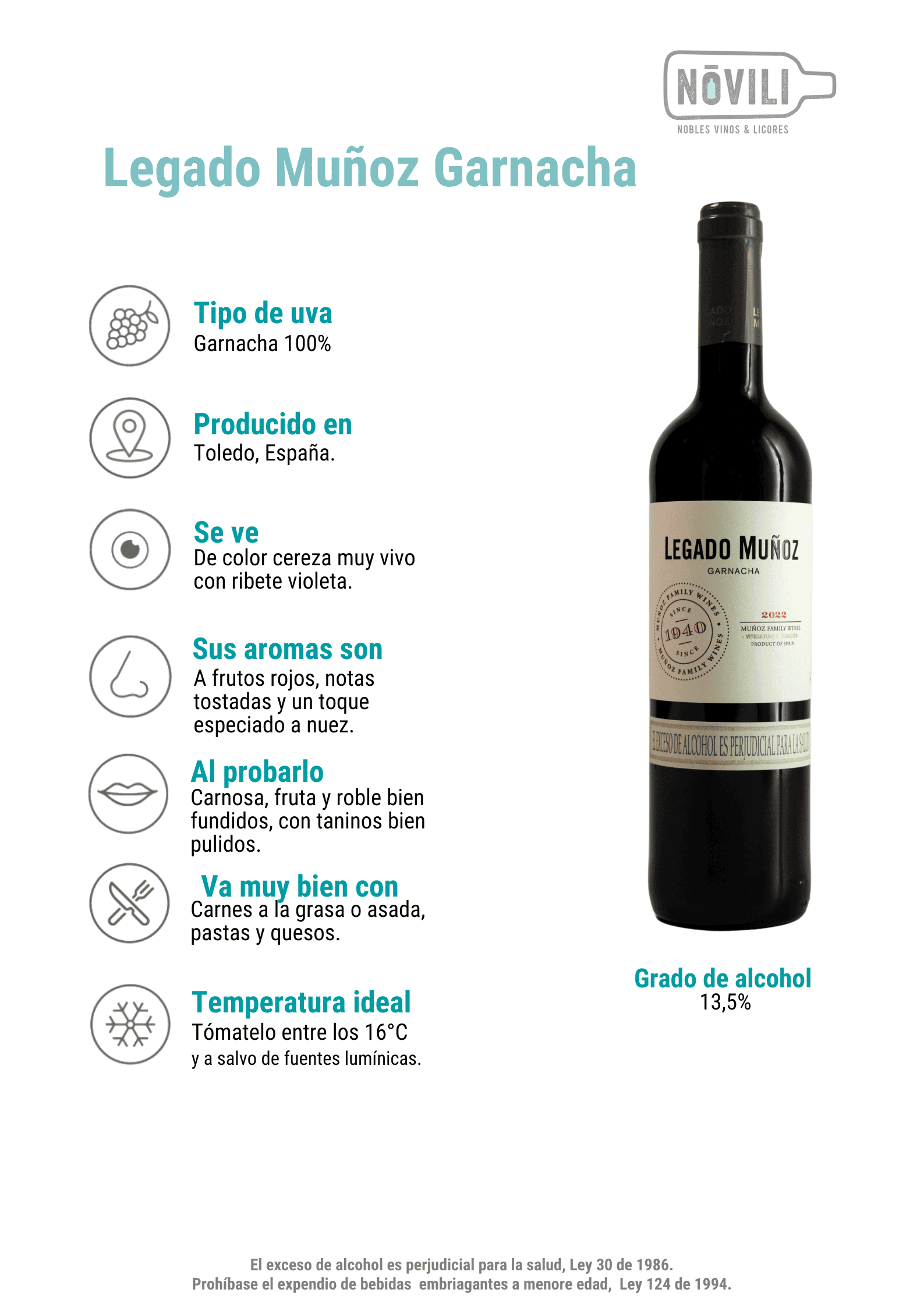 • Temperatura ideal: entre los 16 y 18 °C es la temperatura adecuada para servir tu Legado Muñoz Garnacha