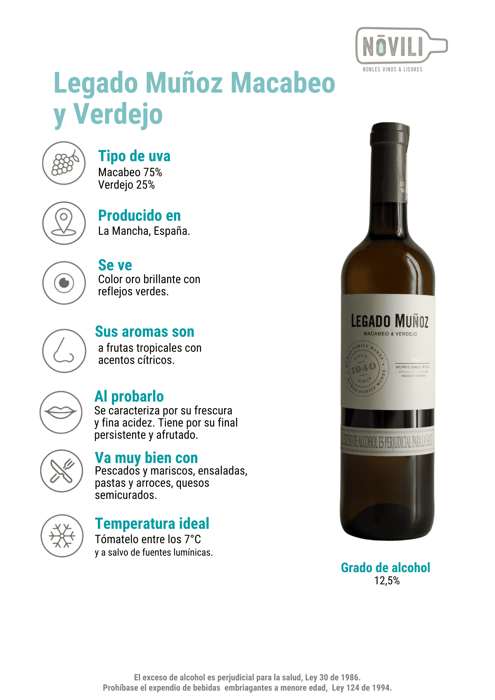 • Temperatura ideal: idealmente, disfruta tu Vino Blanco Legado Muñoz Macabeo Verdejo en una temperatura entre los 5 y 7 °C.