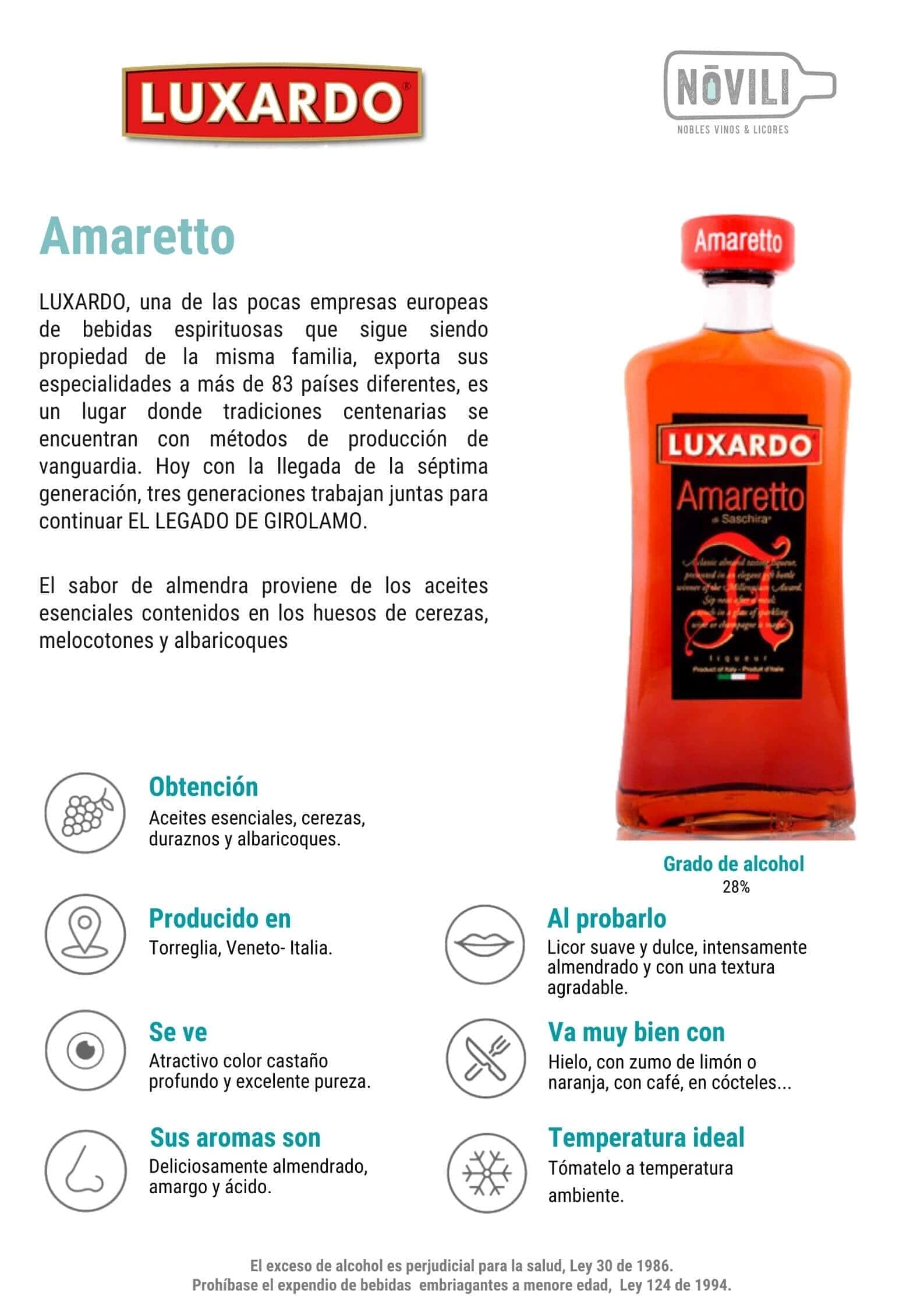 Es momento de probar Amaretto di Saschira Luxardo, un clásico licor italiano con un aroma fragante y un sabor bien equilibrado entre almendra y albaricoque.