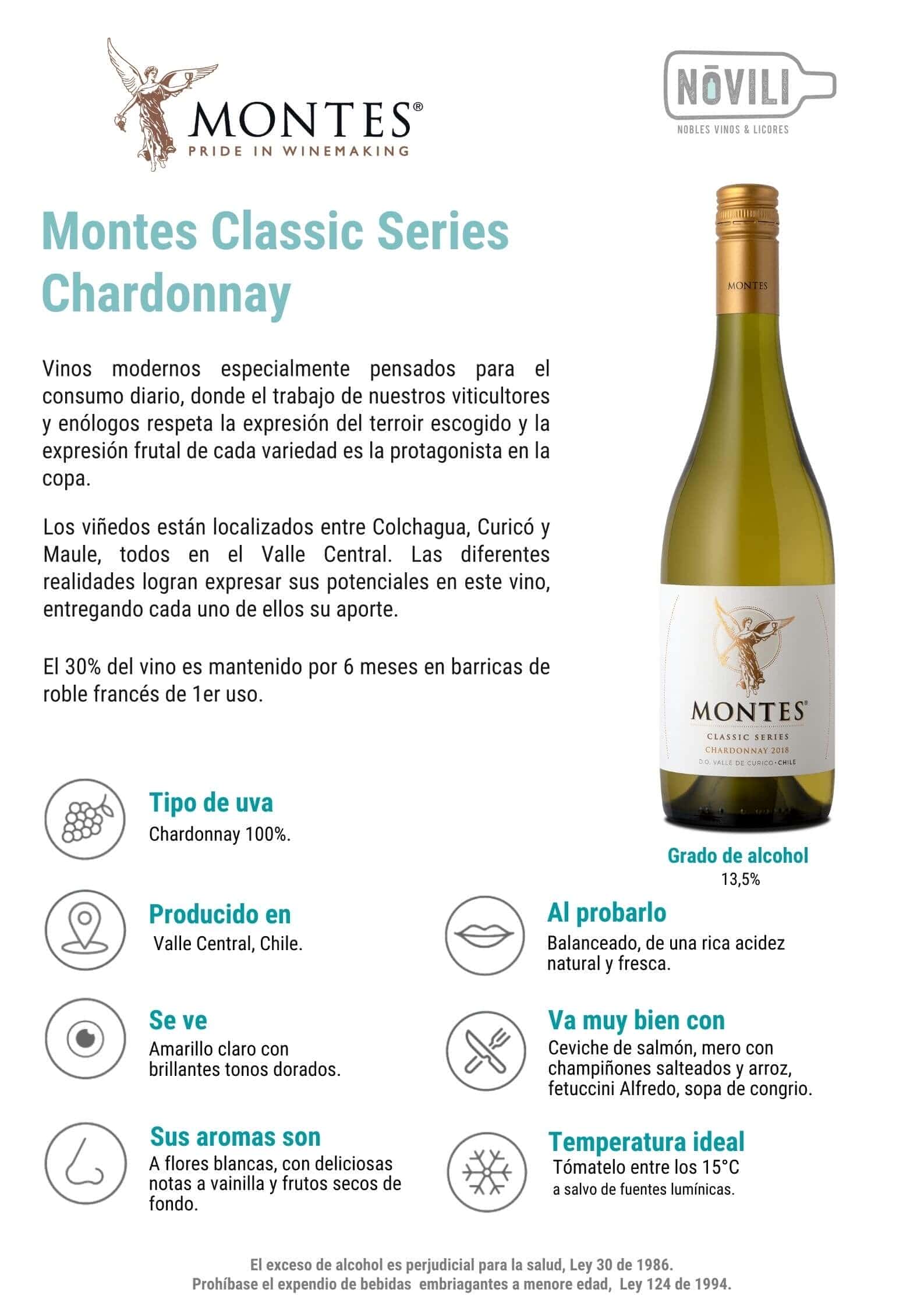- Temperatura ideal: disfruta más tu botella de Montes Classic Series Chardonnay a una temperatura entre los 12 y 13°C.