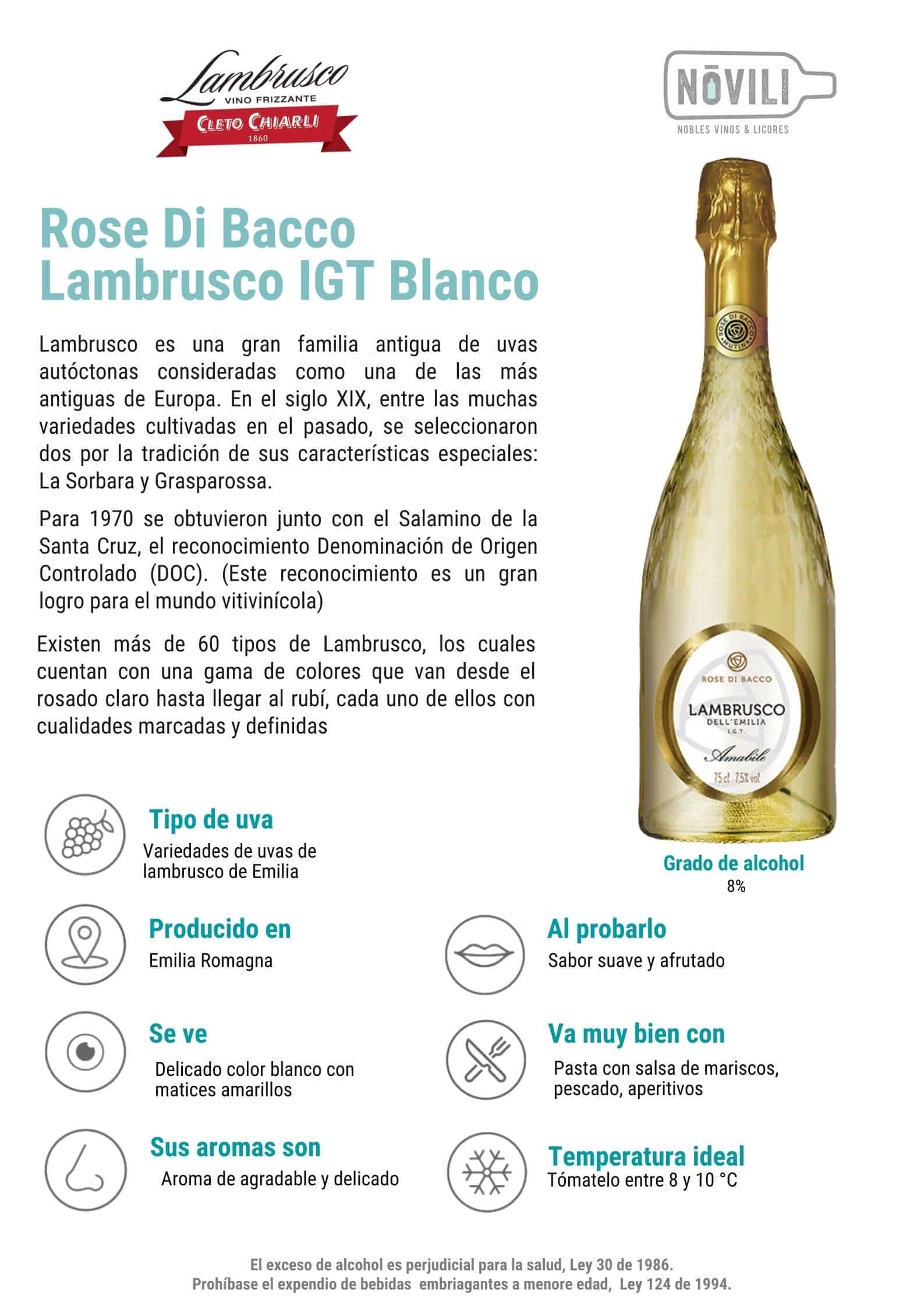 - Temperatura ideal: disfruta más tu botella de Lambrusco Rose Di Bacco Bianco a una temperatura entre los 8 y 10°C.