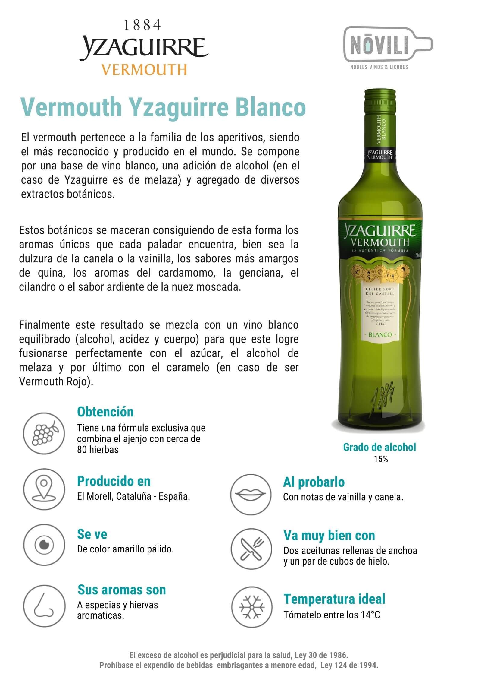 Desde finales del siglo XIX, Bodega Yzaguirre ha perfeccionado su receta de vermouth blanco, una variedad originaria de Francia, que esta importante bodega española ha llevado a un nivel superior de excelencia. Disfrútalo como aperitivo diario.